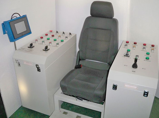 圖1 操控座正面 系統主要由硬件系統、數據庫系統以及虛擬環境仿真控制軟件系統三部分組成。數據庫主要是存儲和中轉信息,管理學員等相關信息和培訓考試操作過程中需要保存或臨時保存的信息;軟件系統主要提供一個虛擬環境,逼真再現起重機駕駛人員駕駛過程情況,讓駕駛員有種身臨其境的感覺,軟件系統部分分為教師端和學生端;硬件系統主要由聯動臺組成。