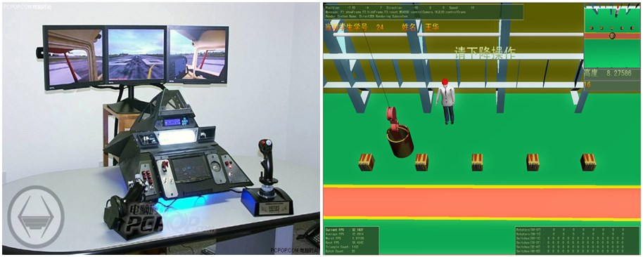 2.虛擬樣機與半實物聯動系統 基于HLA/RTI平臺,構建CPS實驗環境,以CPS技術為基本手段,通過虛擬環境構建與仿真、虛擬環境與物理環境聯動,進行半實物聯動實驗。實驗系統C空間(Cyber)技術研究和開發包括虛擬樣機開發支撐環境的研制,為虛擬樣機的建模、仿真、優化提供支持;實驗系統P空間(Physics)主要是聯動實驗支撐環境的實現,包括基于HLA/RTI,開發各類適配器實現對仿真系統的封裝。 CPS實驗環境已用于某武器的生產過程中,解決了CPS技術在該武器裝置研發中的應用、聯動實驗中的數字化協同仿真技術應用等難題,通過全虛擬仿真和聯動仿真兩種模式能夠對產品外觀、布局進行全局把握,及時了解各部分的干涉情況,有效提高生產線的設計效率,并對其生產能力進行評價。 3.仿真模擬與實際操作活動的信息物理融合 基于半實物仿真的起重機駕駛 起重機模擬培訓與考試系統,由軟件和硬件組成,硬件系統主要由控制柜及聯動臺組成,含有起升機構、變幅機構、旋轉機構、運行機構、安全保護裝置等,軟件系統實現運動仿真和培訓管理功能。 通過軟件和硬件的結合,進行模擬的駕駛操作,如起重機基本操作、相關工種人員指揮手勢識別、定點落物、繞障操作等實操科目的培訓及故障與考核。解決了起重機實際駕駛操作的高危險性、現場實物培訓設備和能耗成本等問題,提高培訓效果,節約資源,提高作業人員的操作技能與安全素質,完善現有的考核程序,最大程度的杜絕安全事故發生的人為因素,且能符合教育特點,具有較強的擴展性,最重要的是場景效果逼真,沉浸感強。